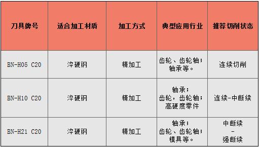 BN-H05 C20涂層CBN刀片屬于超精密加工牌號(hào),適用于連續(xù)切削,可獲得極高的表面粗糙度,BN-H10 C20涂層CBN刀片屬于高耐磨的牌號(hào),適用于連續(xù)-中等斷續(xù)切削,而BN-H21 C20涂層CBN刀片則是專為強(qiáng)斷續(xù)精加工工況設(shè)計(jì)的,具有高抗碎裂和抗崩損性能。淬火鋼零件中常見的齒輪,齒輪軸,傳動(dòng)軸,風(fēng)電軸承,輪轂軸承,回轉(zhuǎn)支撐軸承,滾珠絲杠,同步器,球籠,三銷軸,十字軸等華菱涂層CBN刀片都可以輕松搞定。